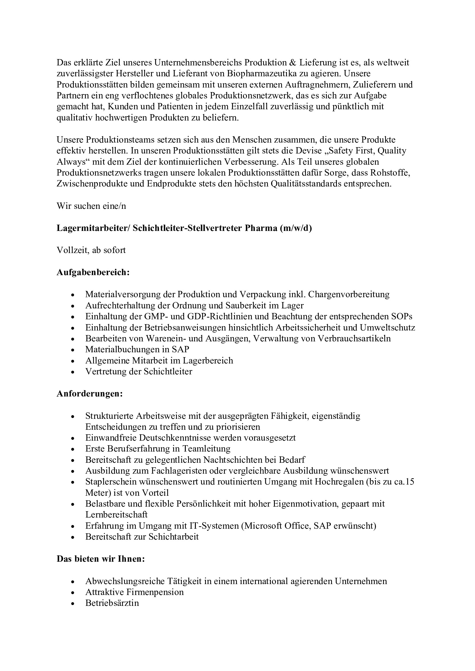 Lagermitarbeiter/ Schichtleiter-Stellvertreter Pharma (m/w/d) [R377957]